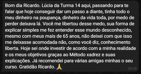 O método segue um passo a passo claro e objetivo, e no final você está com sua carteira de investimentos montada, com os melhores investimentos de acordo com a sua realidade.